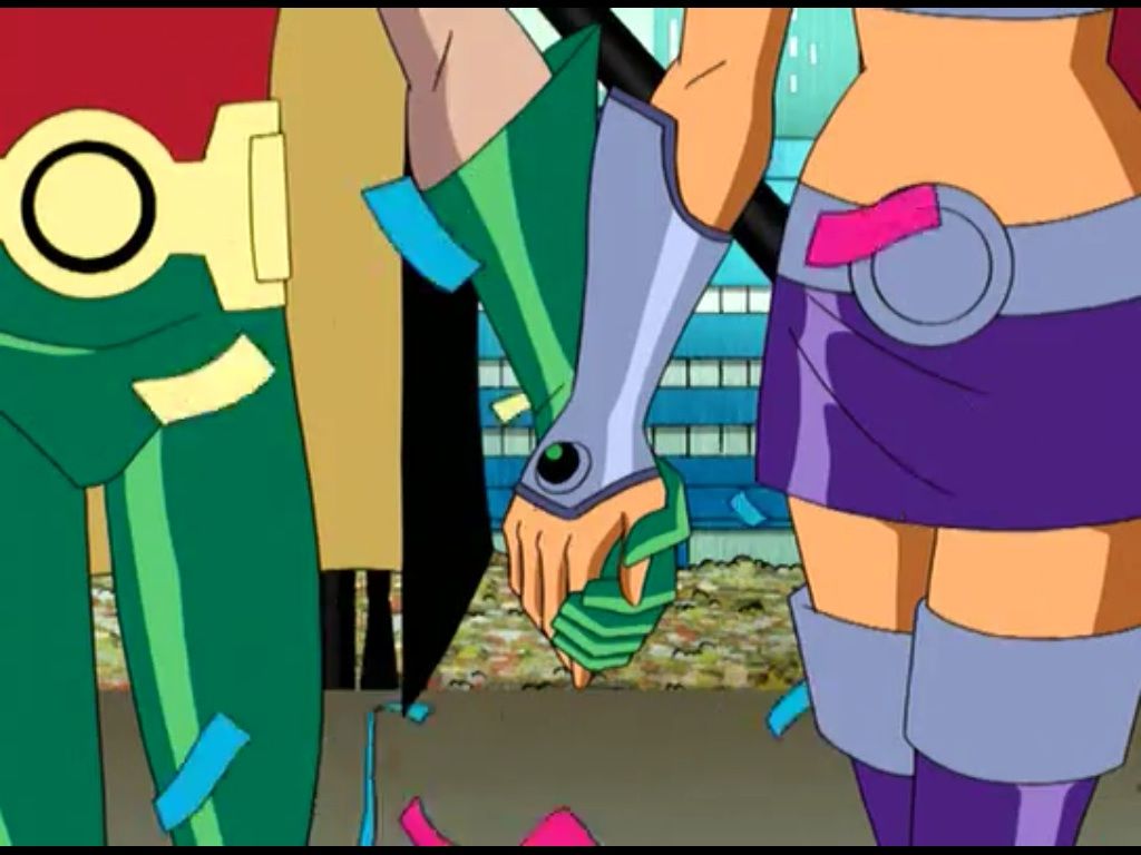 How Adults See It... One thing we learn right from the get-go is that Starfire is not nearly as innocent as she lets on. In their battle with Cinderblock, there comes a time when the villain brandishes a pole, only to have the pole go limp in his hands. This causes Starfire to giggle freely.